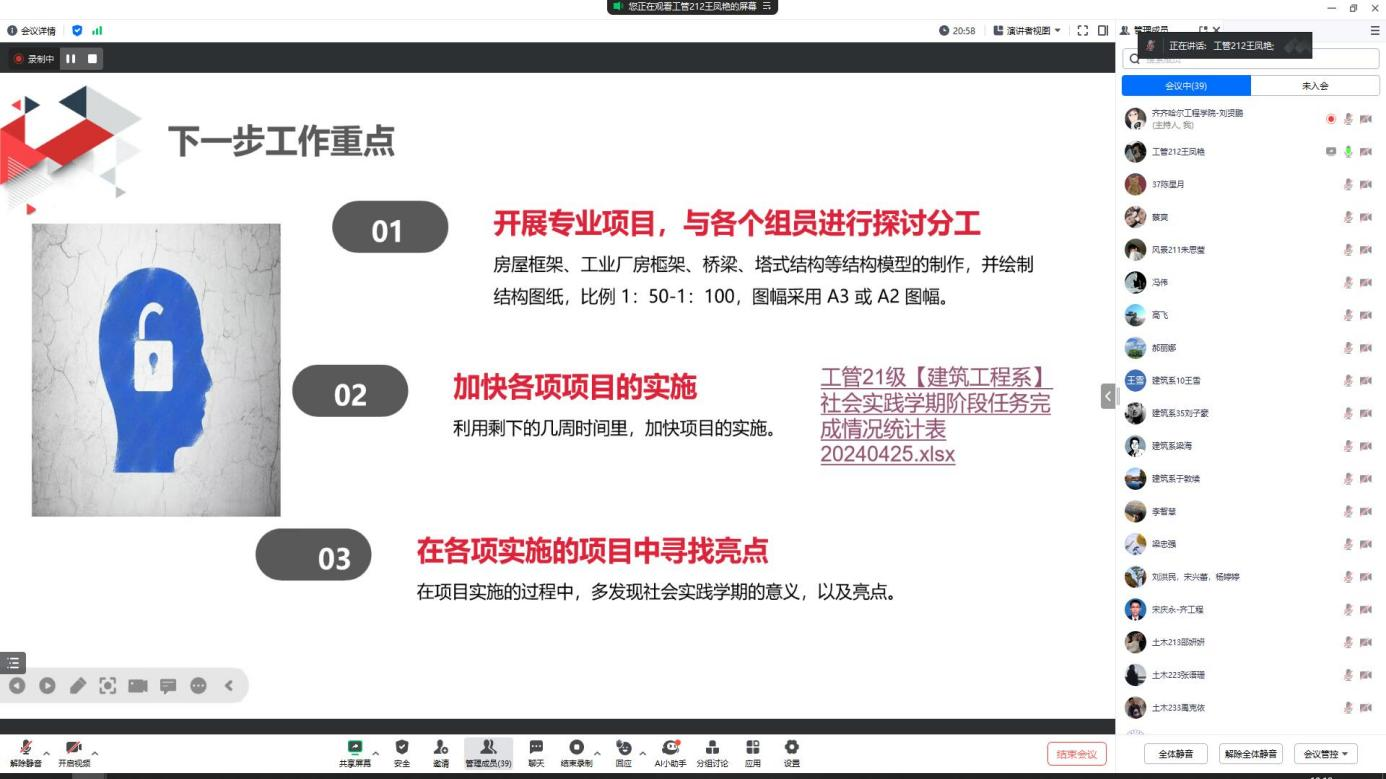 由辅导员和生涯导师推荐,建筑工程系风景园林211班朱思莹、工程管理212班王凤艳、土木工程233班禹克依、土木工程223张语珊、土木工程213邵妍妍作为代表进行了团队汇报。汇报内容包括团队及成员实践任务完成情况、社会实践学期指导教师和辅导员的指导情况、社会实践学期取得的阶段性成果、目前存在的不足以及下一阶段的学习实践方向。