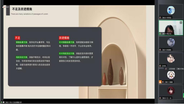 生涯导师李微:1月26日下午,生涯导师李微线上召开社会实践学期总结汇报会,会议由工管211班房芯仪同学主持,指导小组全体同学参加。会上,各小组采用ppt的形式详细总结了第三周各个项目完成情况,李微针对各小组的具体情况分别进行指导,对调查研究报告的撰写以及每一部分的要求进行了讲解,特别强调了新闻报道方面问题,稿件质量还需提高。李微指出,大家不要为了完成任务而完成任务,要通过每个项目的完成能够有所收获,对于存在的问题要及时改正,取长补短,这样才能使社会实践学期更有意义。