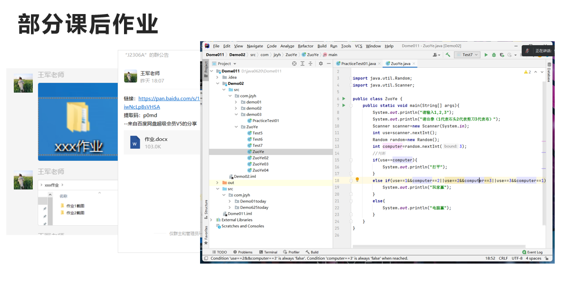 本次专业实践内容为Java开发方向培训,由北京九智云辉金牌讲师王军老师负责教学指导。王老师有着多年从业经验,善于把握就业发展趋势,教学风格风趣诙谐,教学方式为课上课下相结合,培养学生预习能力与课后复习能力,让学生学会学懂学通,并对学生的提问耐心解答,深受学生欢迎。