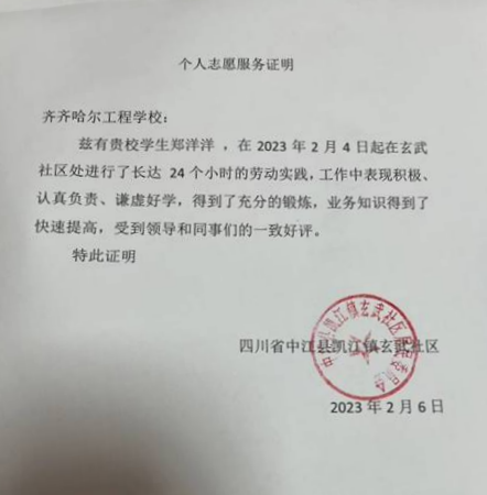 1月26日,我加入村委会卫生部门的志愿工作。当天的工作是收拾仓房,清扫街道上烟花爆竹燃放后的纸屑,以及道边路上的残雪。1月30日,我参加第二次清扫工作。这次的工作量较大,因为过年,人员少、任务重,尽管清扫工作很累,但我也很开心。这次的社会实践经历在书本上是学习不到的,我很高兴可以和村委会里的爷爷奶奶们相处、工作,我和他们沟通交流,获得了很多人生经验。在今后的生活中,我会继续积极参加志愿服务,提升自身能力。