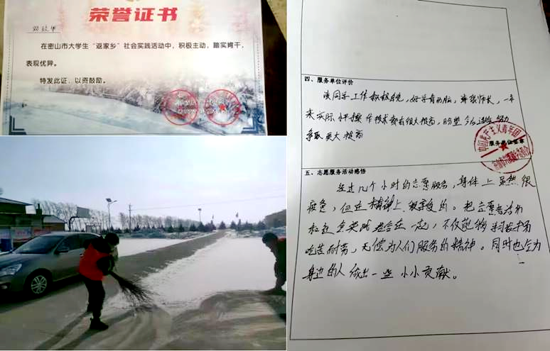 1月5日至2月5日,我在乡村政府做志愿服务,内容包括帮乡里大队贴春联,挨家挨户为老人发放出诊车辆联系卡,帮助大队打扫卫生、清雪,义务教课,帮助村团支部书记处理团务工作等,虽然时间不长,但是学到了很多知识,学会了怎样与人沟通,最重要的是我在待人接物,以及处理人际关系方面有了很大的进步。