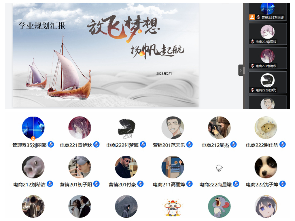 2月10日下午,为了鼓励广大同学以科学的方法规划自己的大学学业,思考并确定学业发展目标,管理工程系生涯导师刘丽娜组织19位学生线上进行学业规划汇报。