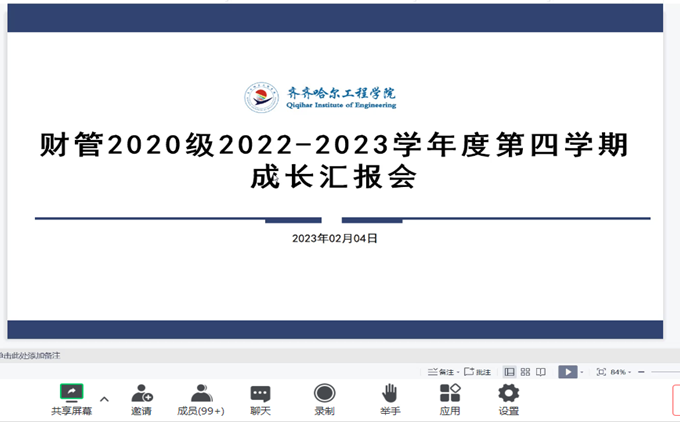 2月4日上午,管理工程系财管2020级学生线上开展“第四学期成长汇报会”。辅导员刘娜老师主持。会上,同学们以PPT展示的形式汇报了实践活动的情况,大家通过图片,视频的方式清晰、直观地呈现自己的学习进展情况。其中,马艺鸣同学在汇报中分享了阅读《顾城经典诗集》的读后感,还向大家介绍了微电影《在场》。汇报结束后,刘娜对同学们汇报的内容进行了点评,提出了整改意见。本次汇报会,加强了同学们之间的交流,为下一步活动开展提供了明确方向,同时也使同学们深刻领悟到开展第四学期的意义。