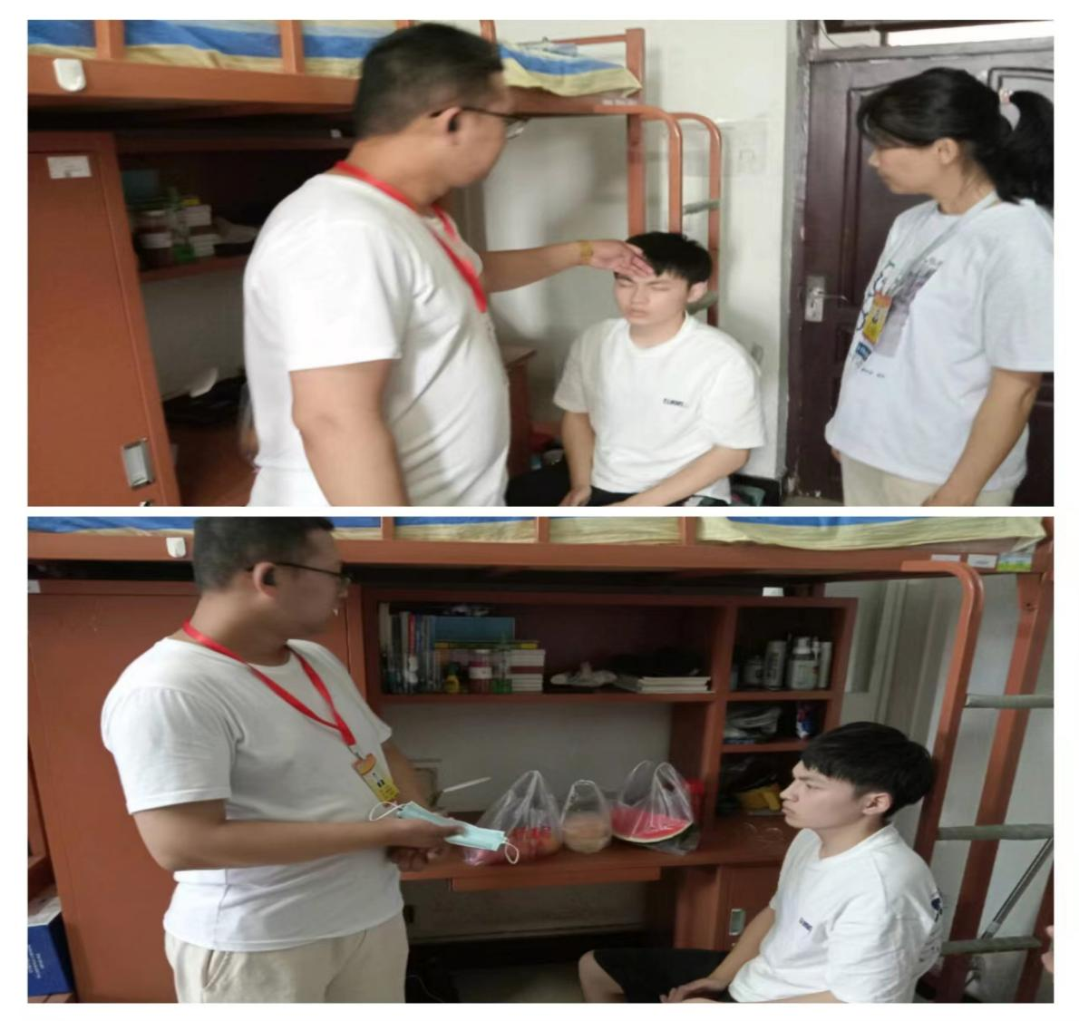 6月29日上午,健康与护理系助产学专业2020级学生王润林同学因头部眩晕,不能到实习单位上班。得知此事后,助产学专业长孙畅、辅导员赵勇,指导老师黄丹、姜万华带着水果前往该同学寝室探望。