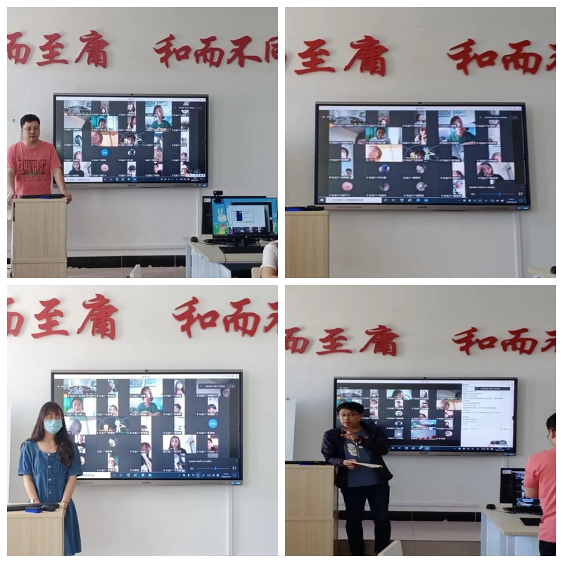 英语专业2020级刘春雨、宋萍萍及该专业2019级李靖怡同学分别代表各自所在实习团队做总结汇报;英语专业2020级赵晓霞、宁世垚、何宗泽及该专业2019级龚小芬四位同学先后分享了实习感想。