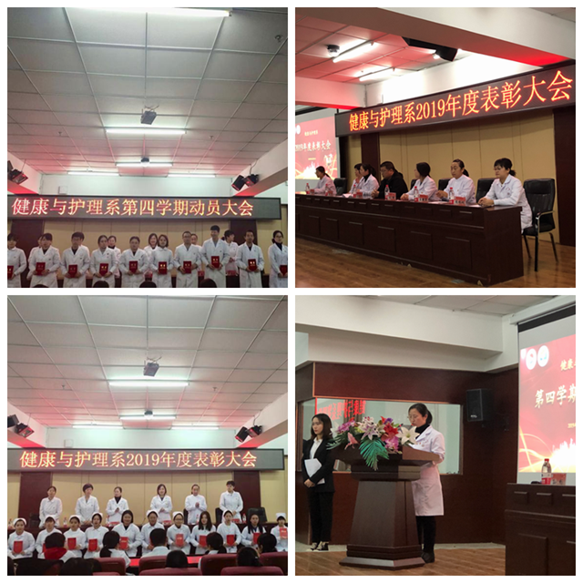 2019年12月31日,健康与护理系年末表彰暨2019-2020学年度第四学期动员大会在图书馆501报告厅召开。学校副院长张振笋,健康与护理系党总支书记、主任张静,系教学工作副主任张平、系学生工作副主任王丽萍、护理学专业长助理张林琳、护理专业长孙畅、健康服务与管理专业长郭玲玲以及系辅导员和第四学期指导教师与近300名学生参加会议。