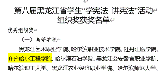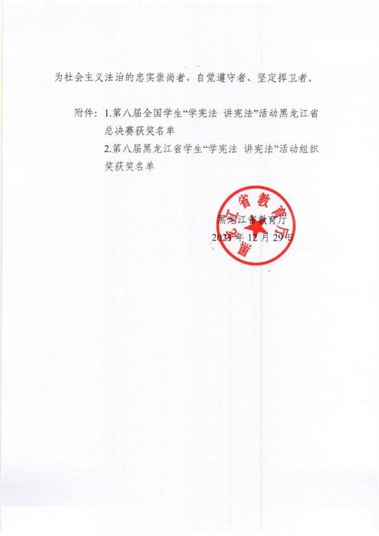 1月2日,我校在黑龙江省教育厅举办的第八届全省学生“学宪法 讲宪法”活动中,喜获优秀组织奖。