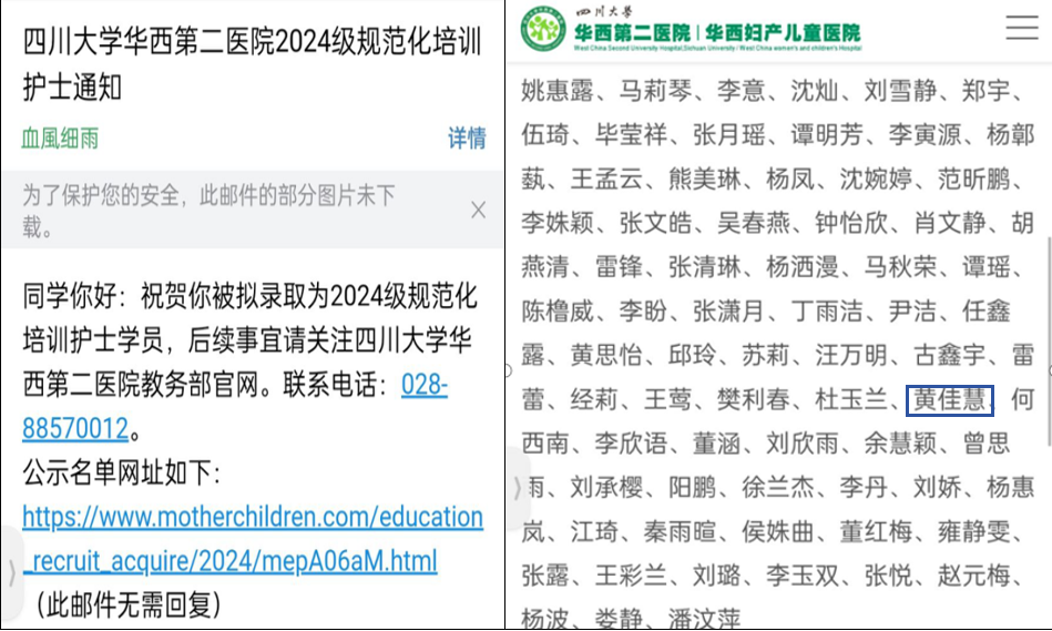 四川大学华西第二医院于3月18日正式公示了2024级规范化培训护士的拟录取名单。经过严格的考核与筛选,健康与护理系助产学专业2020级学生黄佳慧入选,并将于7月正式成为华西第二医院规范化培训护士。