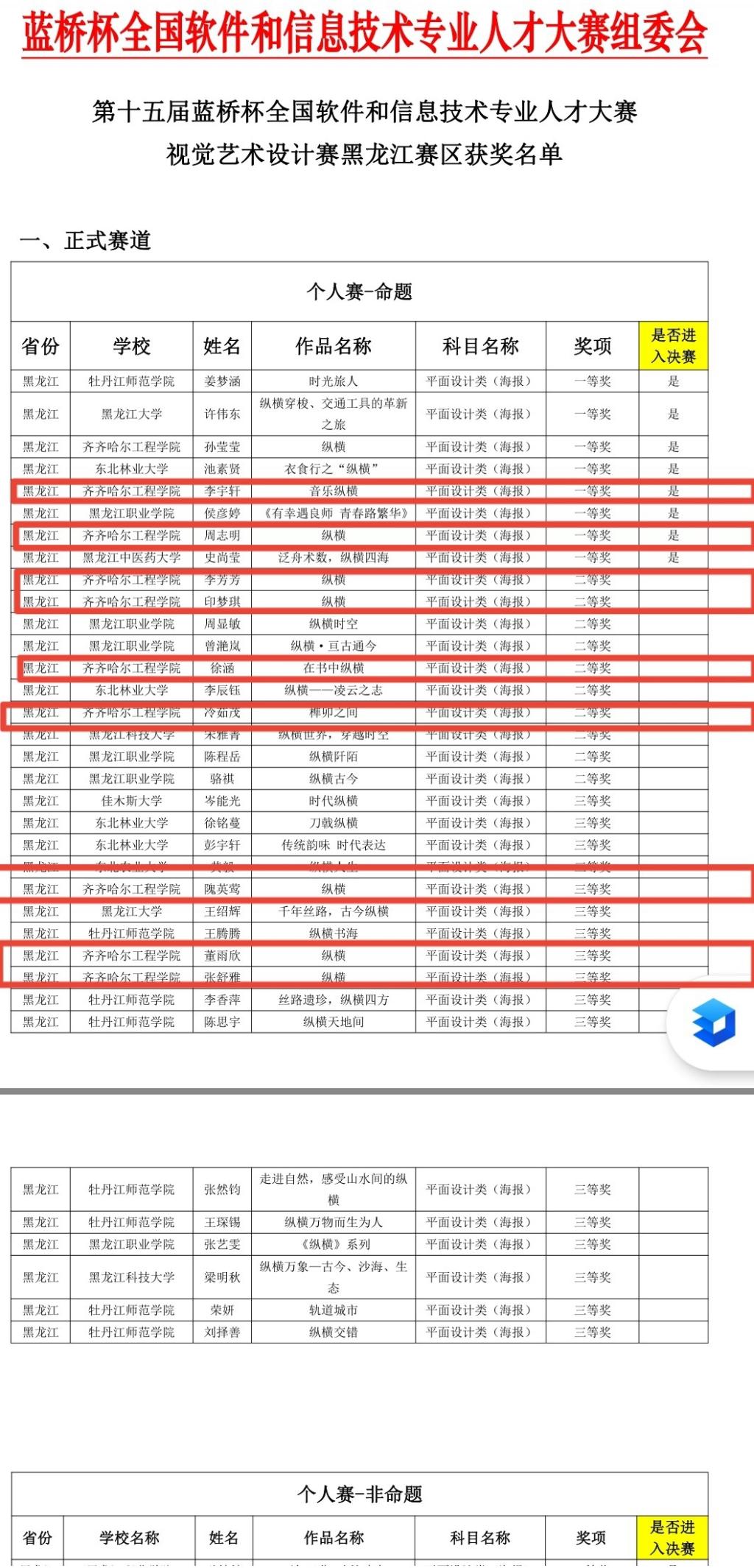 近日,第十五届“蓝桥杯全国软件和信息技术专业人才大赛”视觉艺术设计黑龙江赛区获奖名单公布,信息工程系视觉传达设计专业学生在大赛中取得优异成绩。在本次赛事中,孙莹莹、周志明、李宇轩三位同学获得个人赛命题赛道黑龙江赛区一等奖,成功进入国赛。李芳芳、印梦琪、徐涵、冷如茂四位同学获得个人赛命题赛道黑龙江赛区二等奖;隗英莺、董雨欣、张舒雅三位同学获得个人赛命题赛道黑龙江赛区三等奖。另外,周心玉同学获得个人赛非命题赛道黑龙江赛区一等奖,成功进入国赛。刘楠、陶雨晴两位同学获得个人赛非命题赛道黑龙江赛区二等奖,荆晓娜、黄晓蓉、张琦、张紫豪三位同学获得个人赛非命题赛道黑龙江赛区三等奖。共计17位同学在本次赛事中获得奖项。