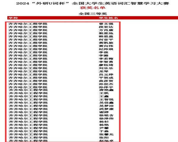 词海扬帆,智慧领航。近日,由外语教学与研究出版社主办的首届“外研U词杯”全国大学生英语词汇智慧学习大赛落下帷幕,经过竞赛激烈的角逐,我校共56名学生取得优异成绩,甘倩菥、李爵、吴旭鹏3人荣获比赛一等奖;蔡颖欣、陈睿等15名学生荣获比赛二等奖;曾文强、段宏达等38名学生荣获三等奖,获奖颇丰。