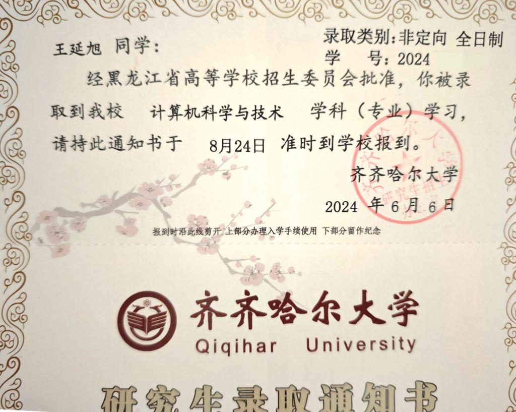 王延旭:从2023年1月份开始,我正式决定考研。首先,做一些对比和规划,查阅考研相关流程,并向学长学姐们咨询考研建议,然后选定专业,最后选定学校。备考过程中,我踏踏实实地看书、做题。出成绩后,我发现离第一志愿还有些距离,在辅导员、生涯导师的鼓励和帮助下,赶紧准备调剂,最终,分别收到了北京联合大学、黑龙江科技大学、齐齐哈尔大学的复试通知,从中选定齐齐哈尔大学。