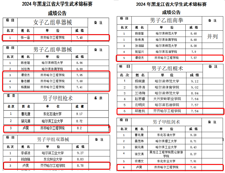 近日,在哈尔滨师范大学举行的2024年黑龙江省大学生武术套路锦标赛传来喜讯,学校武术队个人单项首次获得第一名,团体总成绩取得了第四名的好成绩。