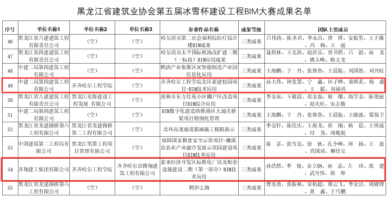 近日,黑龙江省建筑协会公布了第五届冰雪杯建设工程BIM大赛成果名单,我校建筑管理工程系师生与中建二局第四建筑工程有限公司、齐翔建工集团有限公司以及齐齐哈尔市腾翔建筑工程有限公司组队参赛,最终荣获两项三类成果奖项。