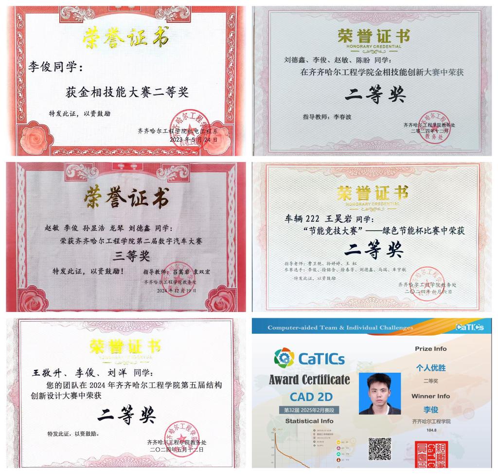 李俊敢于创新、勇于实践,积极参加各项竞赛,他秉持 “知行合一” 的理念,将课堂所学的专业理论知识与实践相结合,通过竞赛提升创新创业知识和动手能力。比赛中,他以严谨的逻辑思维分析难题,以创新的实践突破瓶颈。面对挑战,他跳出固有思维框架,主动拓展知识边界,和团队一起查阅资料、实现创新,充分展现了新时代青年学子敢于挑战、勇于超越的拼搏精神。先后荣获“第29届CaTICs CAD2D(团队赛)国家级”三等奖、“第32届CaTICs CAD2D(个人赛)”国家级二等奖、“第九届黑龙江省大学生光电设计竞赛”二等奖、“节能竞技大赛-绿色节能杯竞赛”二等奖、“大学生节能减排社会实践与科技竞赛”三等奖、“j9在线第二届数字汽车大赛”三等奖、“j9在线金相技能创新大赛”二等奖等荣誉。
