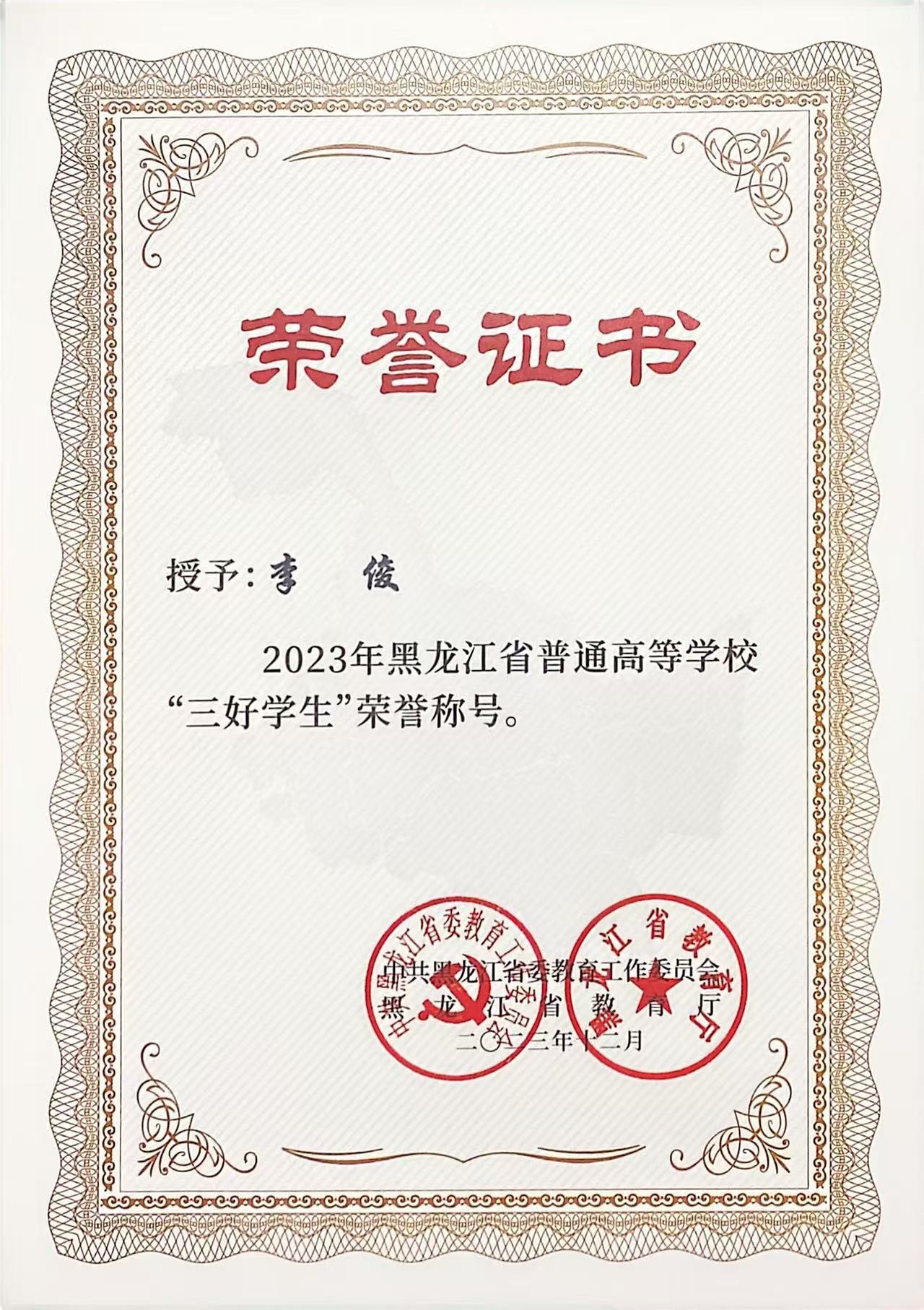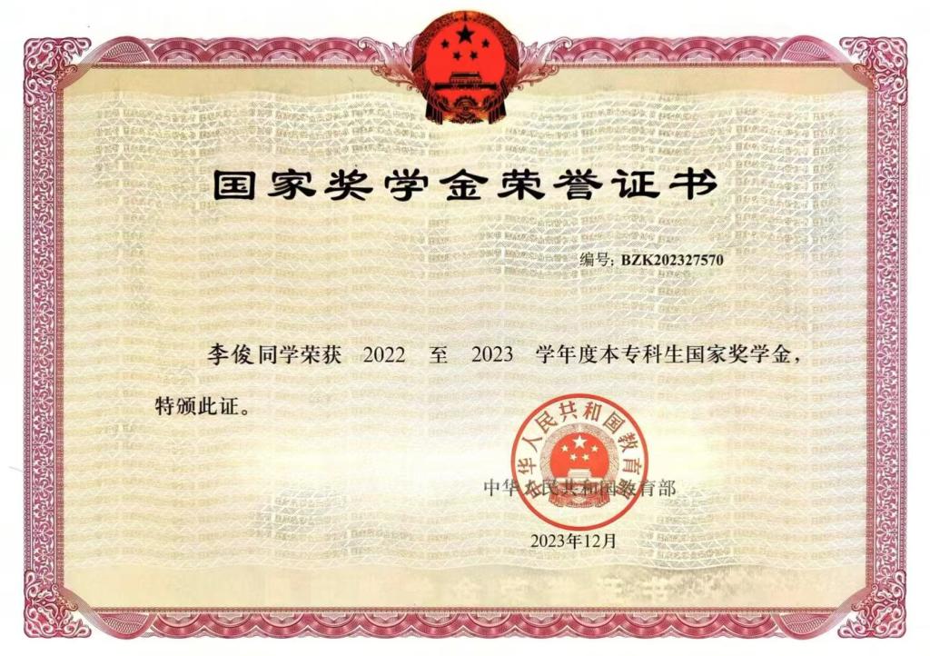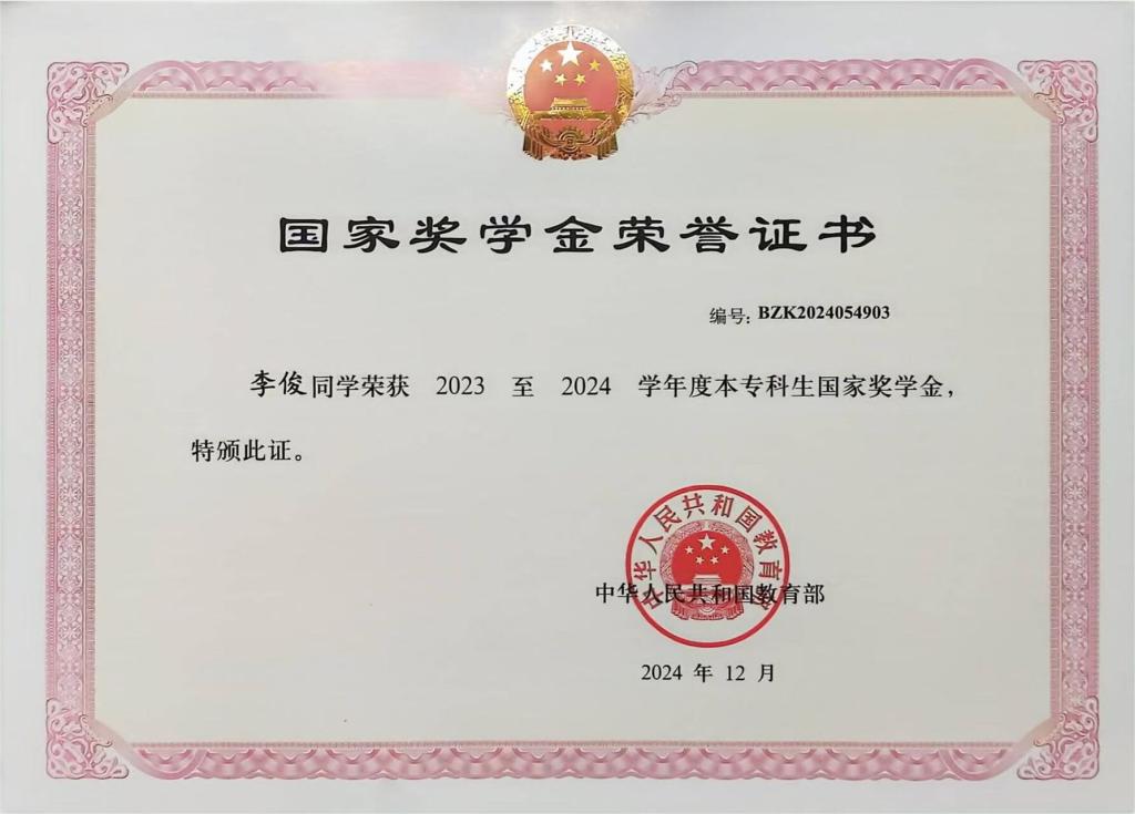李俊为人诚实守信、尊敬师长、团结同学,军训期间,他便以过硬的自律能力脱颖而出,获评 “2022级学生内务标兵”,并获 “2022年新生奖”。