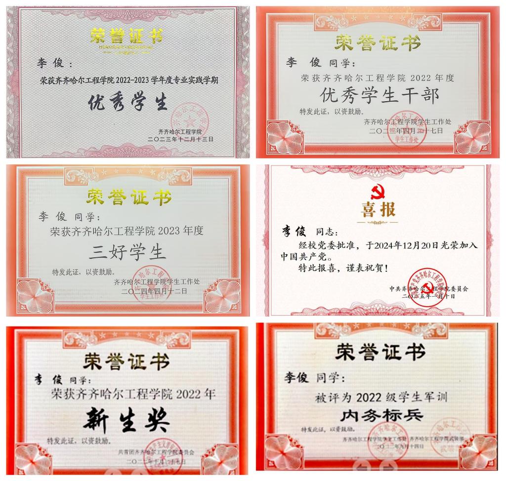 李俊在自身能力得到提升的同时,积极发挥学生干部的思想引领作用,作为班长,他在班级管理中展现出突出的责任担当与创新能力。在班级管理与学生服务中,他严谨务实,将每一项工作任务都做到最好。从日常事务的处理,到班级活动的统筹策划,他以 “零差错、零疏漏” 为准则。面对工作中的难点与短板,他主动分析问题,提出切实可行的改进建议,并全程跟进落实。同时,他敢于突破传统思维,积极探索符合新时代学生特点的工作模式,通过创新班级管理方法、优化活动组织形式,有效提升了工作效率与学生参与度。李俊凭借出色的能力,多次被评为校级优秀学生干部,成为师生沟通的桥梁。