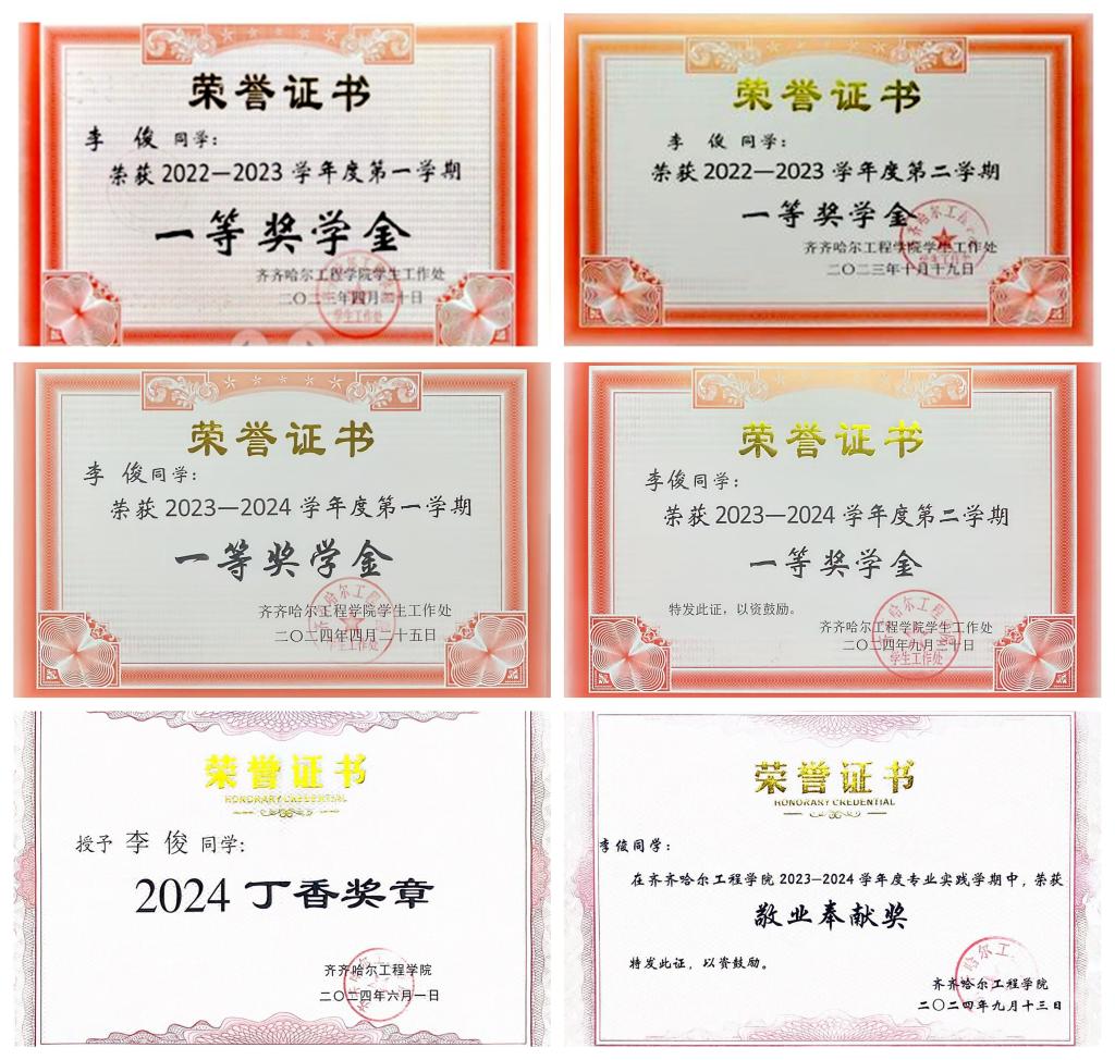 李俊在学业上始终秉持 “笃行不怠” 的态度,努力学习,积极向上,学习成绩始终名列前茅,他在课前坚持预习,课上认真听讲,积极与老师配合;课下勤于思考,理论联系实际,秉承着认真的态度,及时且高质量地完成任课老师布置的课后作业。遇到难以解答的问题,认真向老师和学习优秀的同学请教。在专业实践学期,他意识到实践是成长的最佳途径,他将理论知识与实际操作相结合,进一步提升了工作能力,并为未来走入职场打下了坚实的基础。凭借优异的表现,李俊多次获得校级奖学金,专业实践学期优秀学生,并获得“2024丁香奖章”。