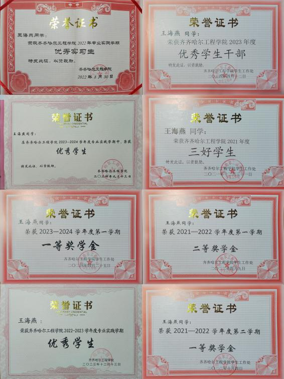 王海燕性格开朗活泼,积极乐观,热爱集体,团结同学。她在思想上,积极向党组织靠拢。在学习上勤奋努力,制定了明确的学习目标及高效的学业规划,学习成绩和综合测评均位于专业第一名。她利用课余时间认真学习英语,并在大一期间通过全国大学英语四级考试。生活中,她作为班级的学习委员,不仅自己在学业上刻苦钻研,成绩始终名列前茅,更在课余时间积极组织同学们开展学习小组活动,共同攻克学习难题,并积极配合其他班级干部的工作,协助老师做好班级的管理工作。同时,她主动参加学校的各项活动,践行社会主义核心价值观,积极参与校内外志愿者服务。在学校的社会实践学期中,参加社区志愿服务,并获得社区的表扬信。
