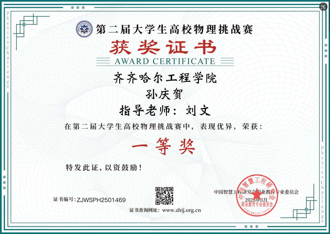 近日,第二届大学生高校物理挑战赛传来喜讯,我校学生孙庆贺等3名同学荣获一等奖,盖晟喆等7名同学荣获二等奖。