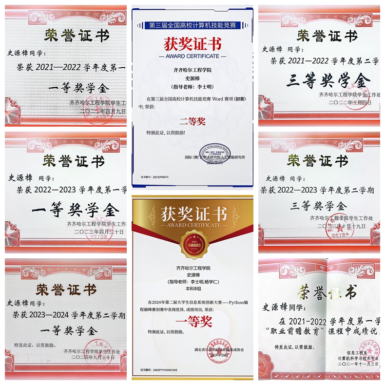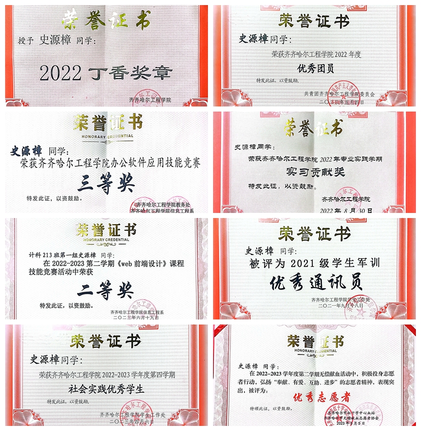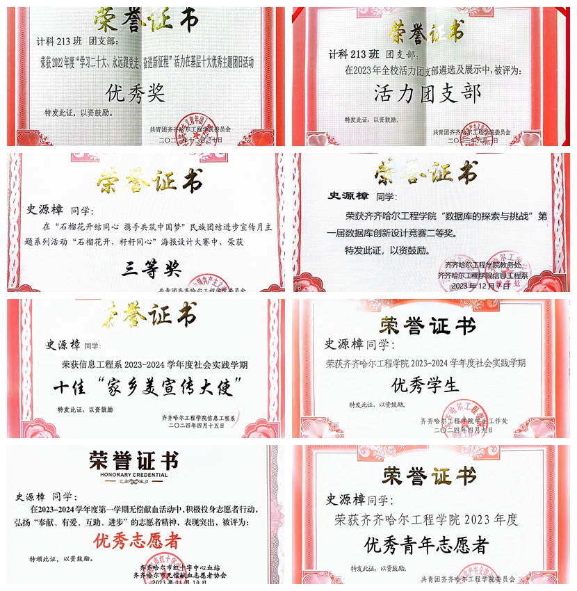 史源樟,女,信息工程系计算机科学与技术专业学生,国家励志奖学金获得者、黑龙江省三好学生、齐齐哈尔市优秀共青团员,多次获得校级奖学金。在“j9在线办公软件应用技能竞赛”中荣获三等奖,获得“学习党的二十大、永远跟党走、奋进新征程、活力在基层”十大优秀主题团日活动组织策划奖,史源樟多次组织并参与团学活动,充分展现新时代青年全面发展的良好风貌。