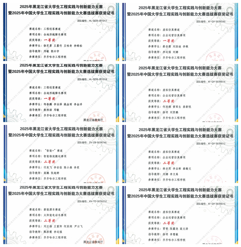 我校参赛团队在指导教师的悉心指导下,以精益求精的态度打磨作品,以默契高效的配合应对挑战,最终在众多强手中脱颖而出,斩获22项省级奖项,充分展现了齐工程学子“重实践、敢创新、善协作”的精神风貌。