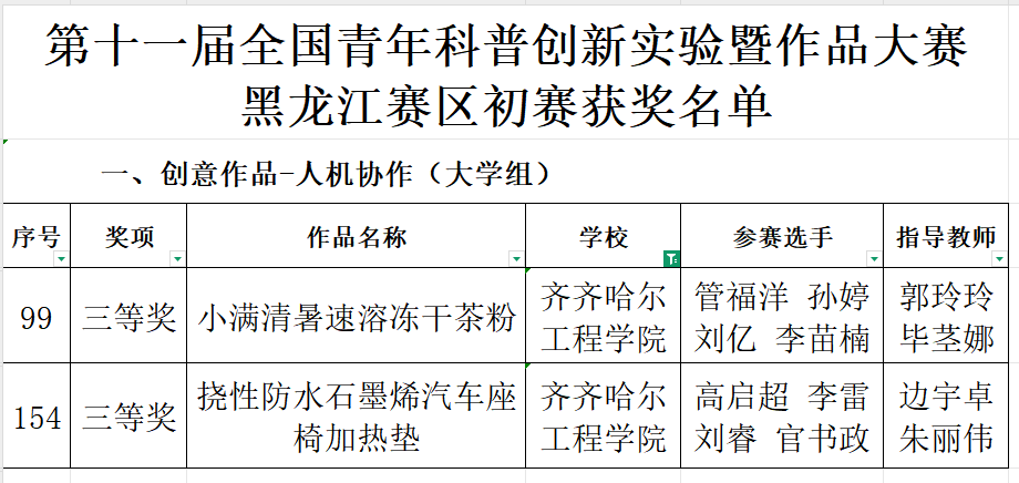 近日,第十一届全国青年科普创新实验暨作品大赛(黑龙江赛区)初赛结果揭晓,我校管福洋等同学的《小满清暑速溶冻干茶粉》、高启超等同学的《挠性防水石墨烯汽车座椅加热垫》荣获省赛三等奖。