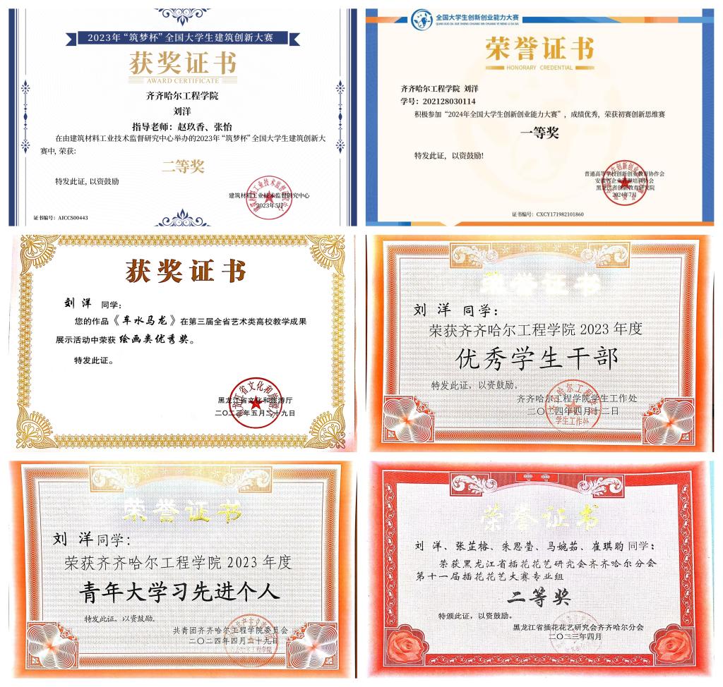 刘洋勇于挑战自我,积极参加各类竞赛,在2024年全国大学生创新创业能力大赛初赛创新思维大赛获一等奖、第28届caticsCAD2D个人赛获三等奖,带领团队获黑龙江省第十一届插花花艺大赛省级银奖、2023年“筑梦杯”全国大学生建筑创新大赛二等奖、第三届全省艺术类高校教学成果展示活动绘画类优秀奖等。