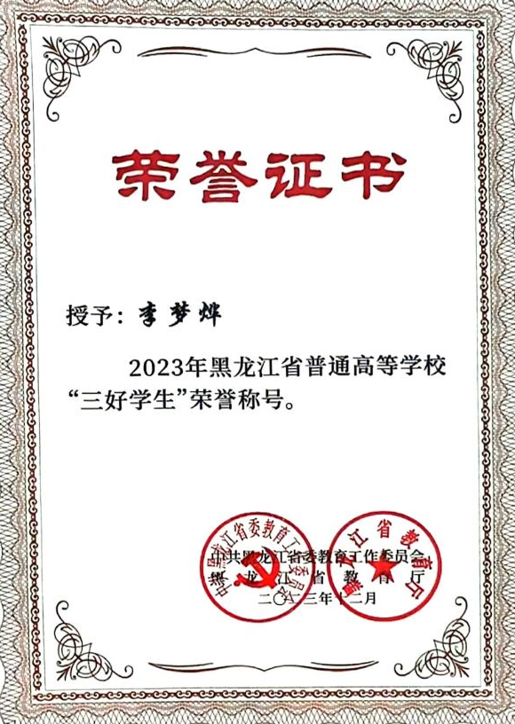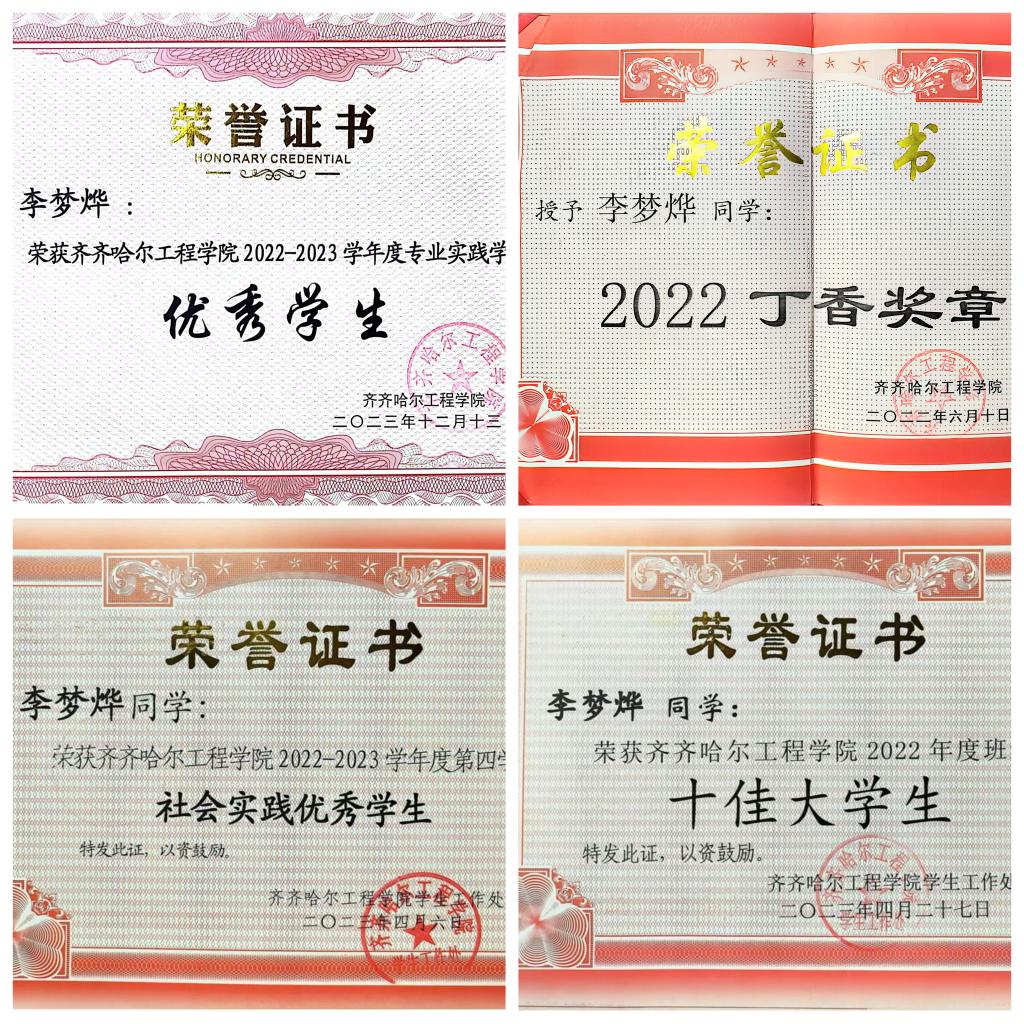 李梦烨在中国人民解放军空军特色医学中心实习期间,她在中西医结合正骨科表现出色,获得教学查房三等奖,并被评为“空军特色医学中心优秀实习生”、在齐齐哈尔医学院附属第二医院的实习同样获得认可,被评为“齐齐哈尔医学院附属第二医院优秀实习生”。这些实践经历让她将理论知识与临床技能完美结合。
