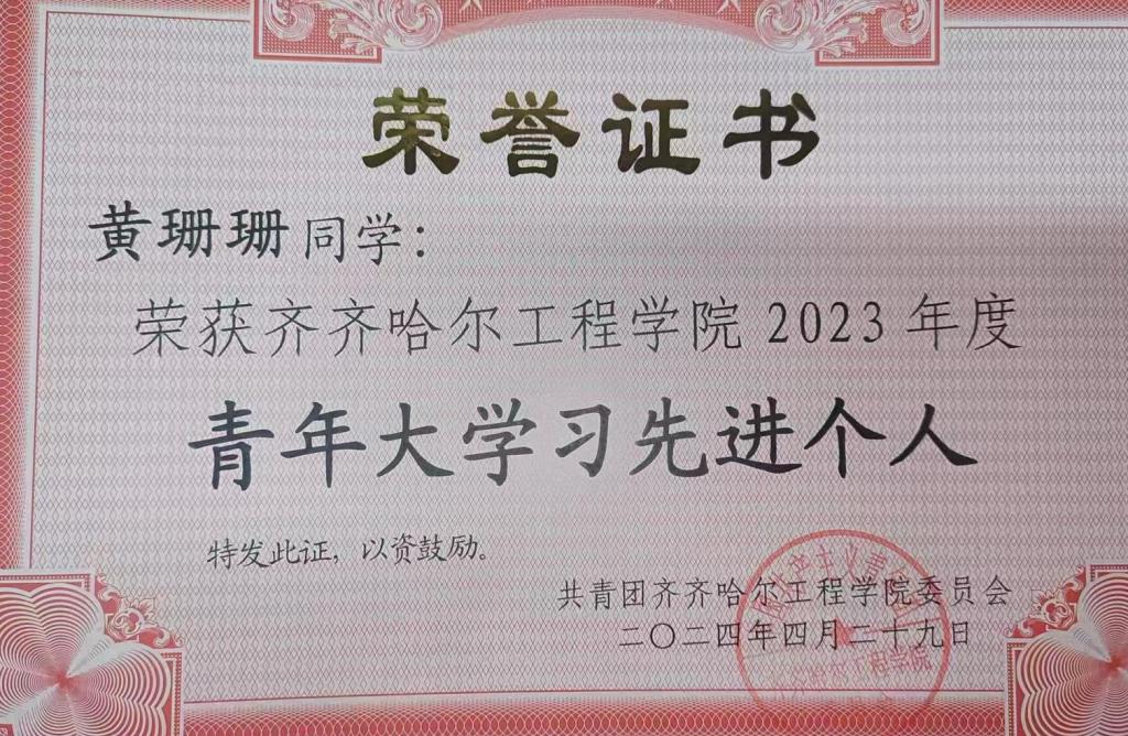黄珊珊在思想上始终保持积极进取的态度,她深知理论学习的重要性,不仅认真参加思想教育活动,还主动通过多种渠道加强理论学习,不断提升自身的思想修养。在生活中,她更以实际行动发挥带头作用,积极带动身边同学共同进步,并荣获j9在线 2023 年度“青年大学习先进个人”称号。