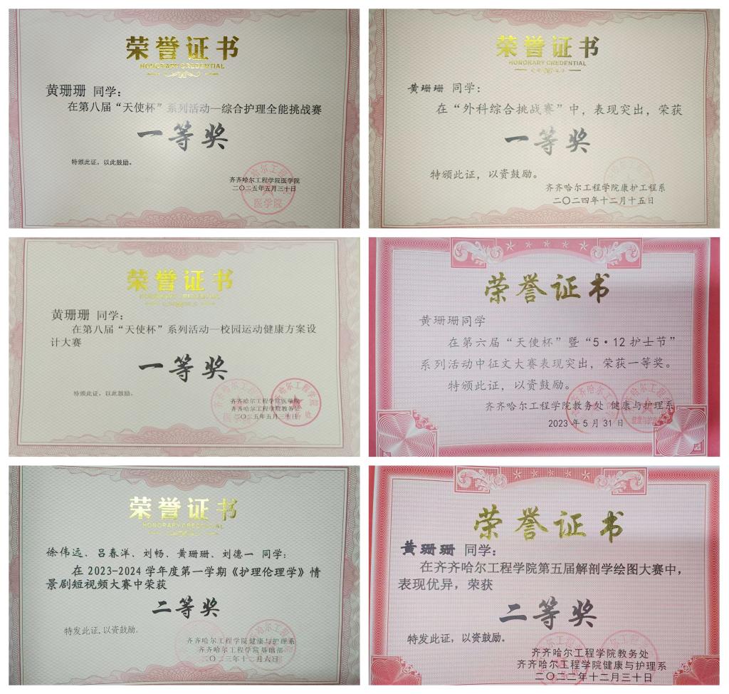 在团队比赛中黄珊珊同样表现出色。在2023-2024学年《护理伦理学》情景剧短视频大赛中,她与队友默契合作,将护理伦理知识融入剧情,演绎临床护理中的伦理抉择与人文关怀,获得二等奖;在《健康评估》技能大赛中,她和队员们精准运用评估技巧,高效完成健康数据采集与分析,获得二等奖;在《大健康产品设计大赛》时,她从护理专业角度出发,积极参与产品设计与优化,团队荣获优秀奖。这些竞赛经历不仅提升了她的专业技能,更培养了她的团队协作和综合实践能力。