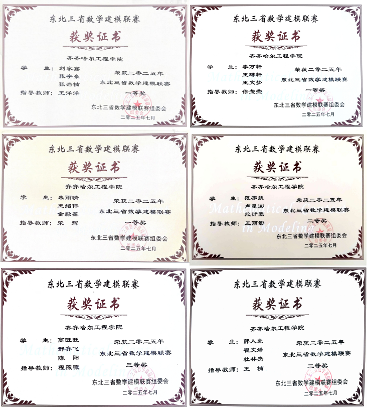 近日,2025年东北三省数学建模联赛获奖名单正式公布,我校学子凭借扎实的专业功底与创新思维脱颖而出,11支参赛团队从众多竞争者中突围,一举揽获一等奖3项、二等奖3项、三等奖5项,展现出强劲的学科竞赛实力。
