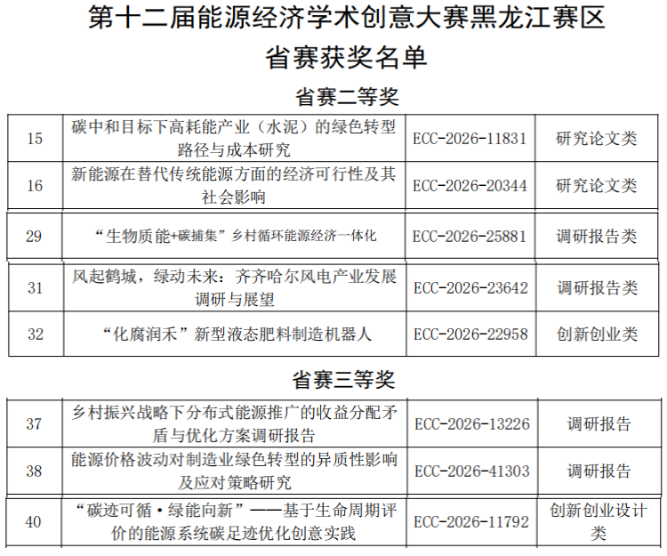 全国大学生能源经济学术创意大赛是由中国优选法统筹法与经济数学研究会主办、低碳发展管理专业委员会承办的全国性赛事,是我国能源经济领域最具影响力的大学生学术竞赛之一,已被列入全国普通高校大学生竞赛目录中。竞赛设置论文类、创新创业类、社会调研类三大赛道,本次比赛共有24所高校参加,315组作品参赛,经过激烈角逐,我校学子凭借扎实的专业基础、创新的思维能力和出色的现场表现,从众多参赛选手中脱颖而出,共荣获省级二等奖5项、三等奖3项,其中土木与管理学院刘岂晓、曲圆,机电学院王思颖、李文焱金家齐等团队分别荣获省级二等奖,土木与管理学院苏娣、陈涛、机电学院黄慧妮等团队分别荣获省级三等奖。