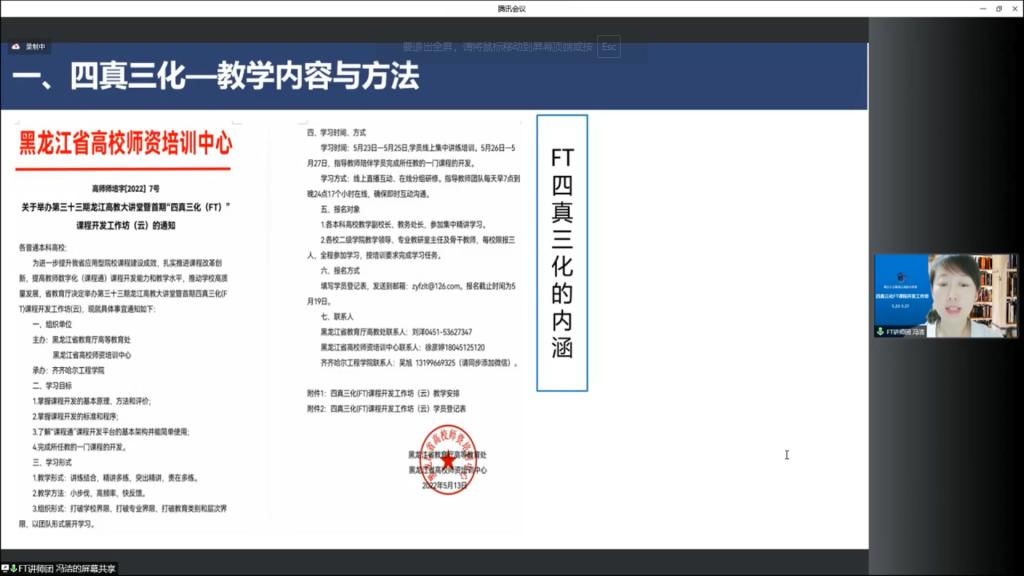 FT讲师团冯洁老师进行四真三化(FT)课程开发工作坊总结。本期工作坊由省教育厅高教处、高师培训中心主办,j9在线承办,来自全省32所本科高校156名学员参加培训,其中教学副校长23人,教务处长30人参加集中学习,创设教学校长组以及教务处长组,同时学校还为103名二级学院的院长、教研室的主任以及骨干教师配备了指导教师18名。创设沉浸式“手把手”学习的平台,生师比达到了5.8:1。学员开发课程92门,结业率达到89.32%,并评选出优秀学员25人。学员在学习过程中从7点到24点不间断地交流与沟通,深刻地领会了“以终为始,开发课程;以始为终,控制质量”,实现了“教师可操作,质量可控制、评估可追溯、交流可复制”的良好的效果。