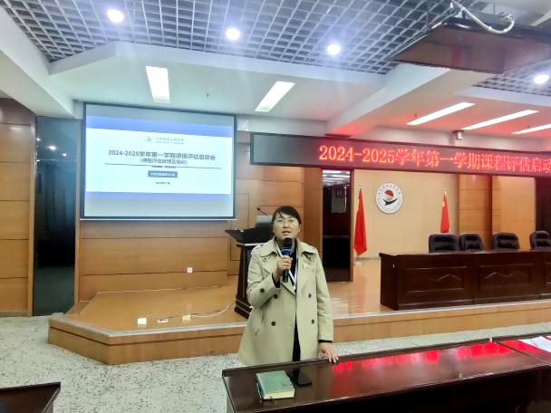为做好2024-2025学年第一学期课程评估工作,11月27日下午,全面质量管理办公室在图书馆601报告厅组织召开本学期课程评估启动会,会议内容为2023-2024学年第二学期课程评估反馈及2024-2025学年第一学期课程评估工作培训。副院长张静出席会议,本学期课程评估评委、各开课单位主管教学领导以及本学期参评课程的课程负责人参加。会议由全面质量管理办公室副主任孟艳辉主持。