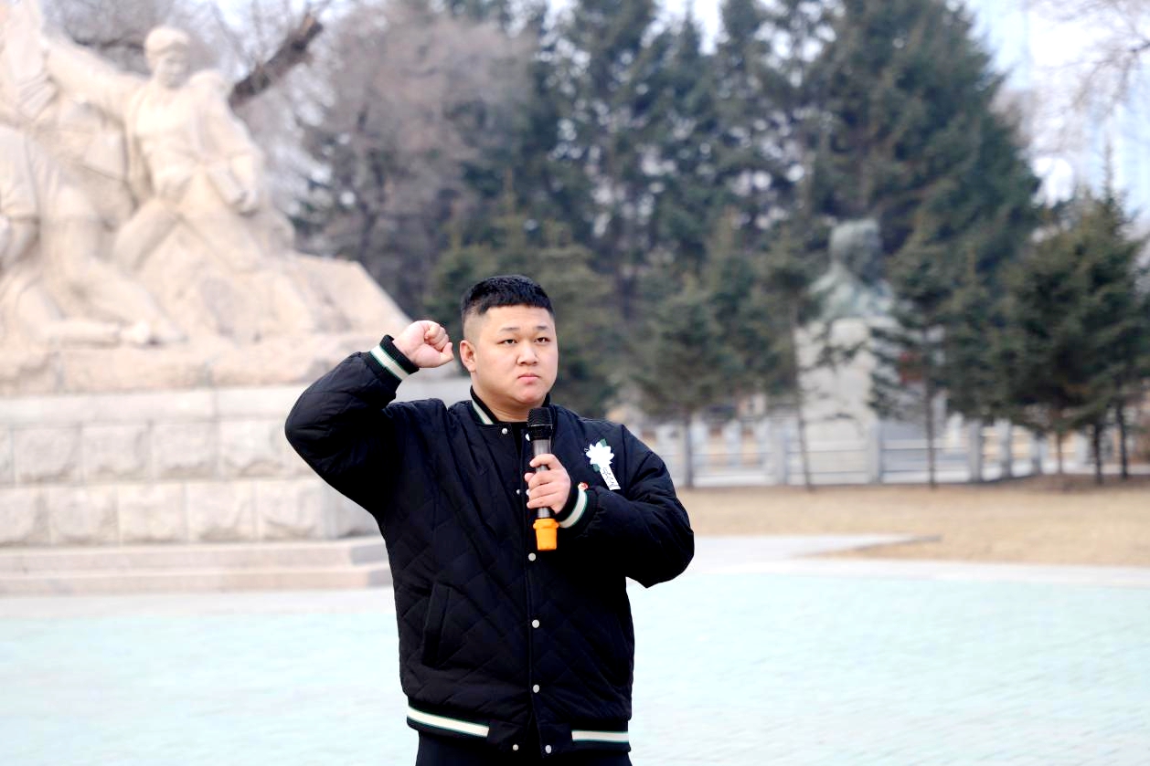 学生代表机械221班孙显浩发言,表示作为学生干部要继承先烈遗志,努力学习,积极进取,为实现人生价值和祖国的繁荣富强而努力奋斗。