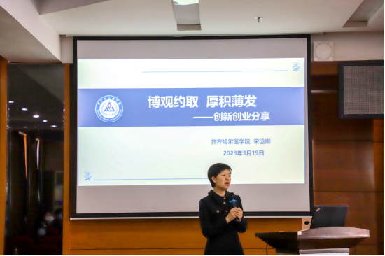 齐齐哈尔医学院宋运娜教授则是通过博观而约取、厚积与薄发等方面,围绕人员人脉、才干能力、政策动向以及奉献投入四个方面为各位同学讲诉她的创新创业经历。