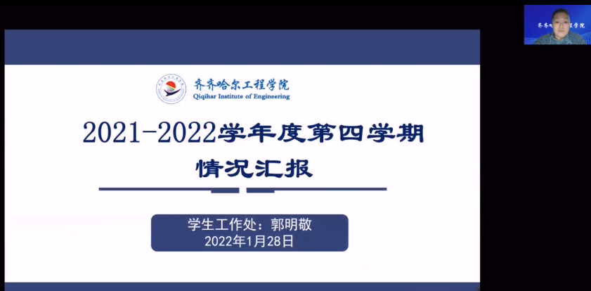根据《j9在线2021—2022学年度第四学期实施方案》的要求,1月28日下午,学校在线召开2021-2022学年度第四学期阶段总结会。副院长张振笋、建筑工程系、管理工程系主任陈景鑫、机电工程系主任郭磊、信息工程系负责人刘春媛、健康与护理系负责人郭玲玲、各系学生工作副主任及全体辅导员和学工处老师参会。会议由学生工作处副处长郭明敬主持。