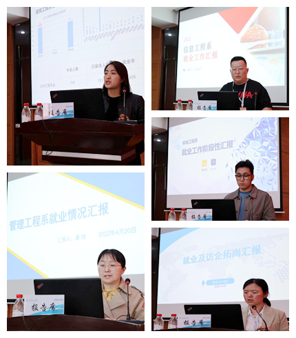 建筑工程系、管理工程系、信息工程系、机电工程系、健康与护理系分别汇报了2022届毕业生就业工作情况,基于数据介绍做法,明确差距,梳理改进思路。