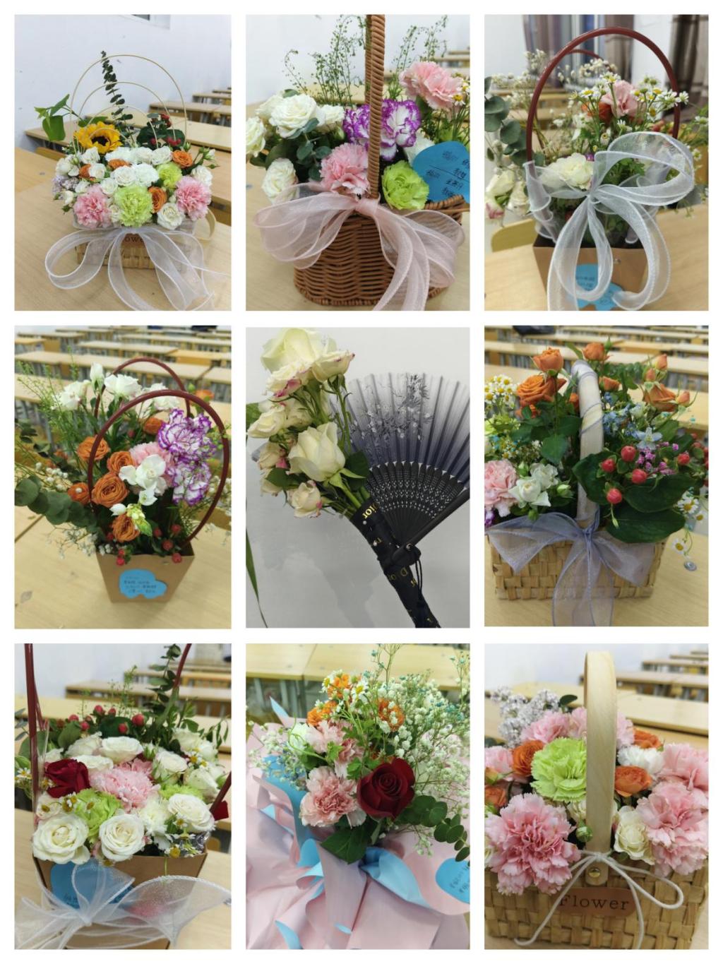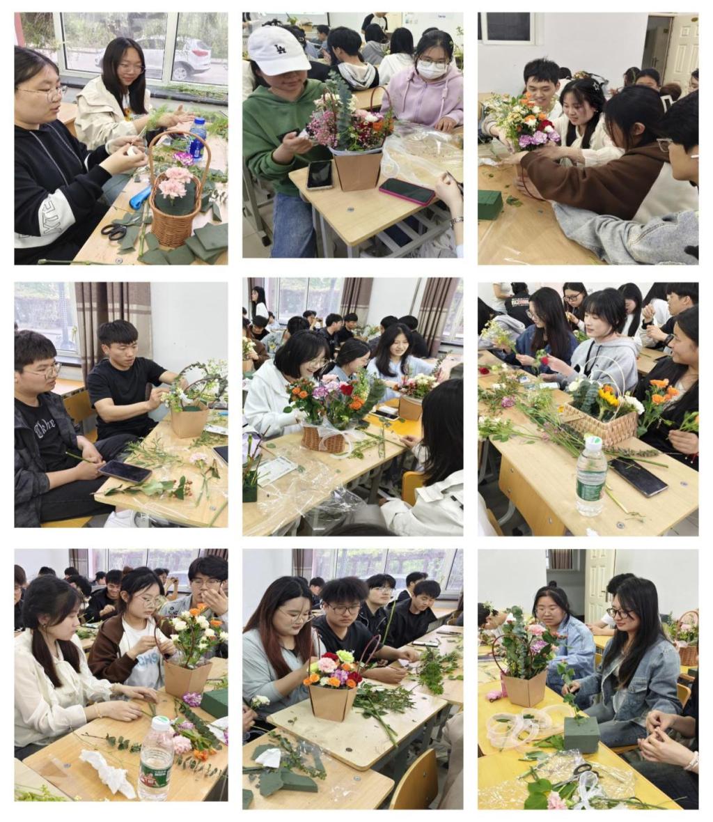 活动开始前,夏雨薇讲解了规则并分发材料,学生以四人小组的形式展开合作,用花材和工具制作花束。各个团队发挥创意,制作插花作品,融合古典美与现代元素。最终,由建筑工程系团总支评出一等奖五名、二等奖十名、三等奖十五名、优秀奖若干。