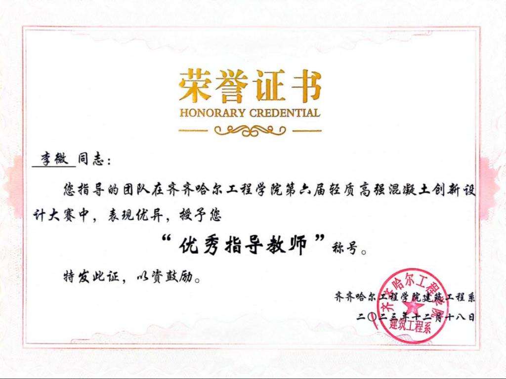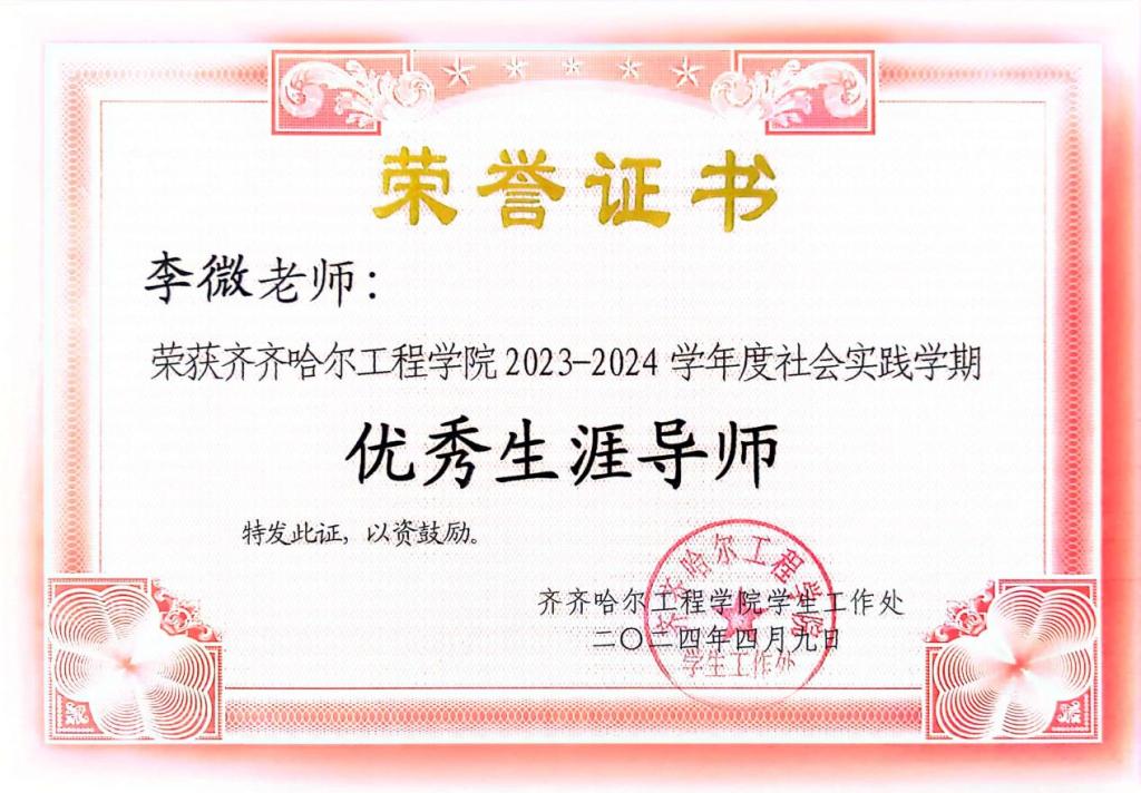 她作为生涯导师,积极鼓励学生参与科研实践,培养创新思维,多次指导学生参与创新训练计划。通过比赛能够使专业知识和各项技能有所提升,在备赛过程中,尽可能地为学生提供帮助和指导。她所指导的学生多次在创新创业、学科竞赛和兴趣爱好比赛中荣获荣誉,同时,李微也多次获得优秀指导教师称号。其中工管211班章海滨获得全国2023年数字建筑创新应用大赛团队三等奖。