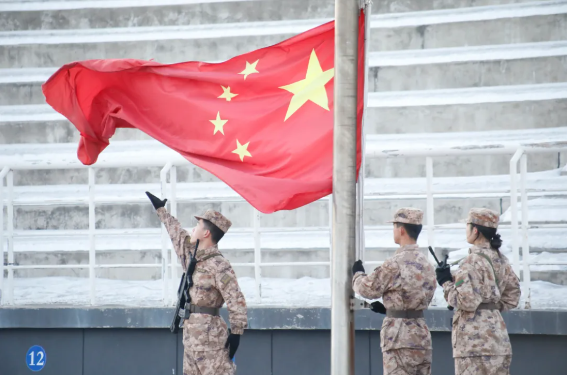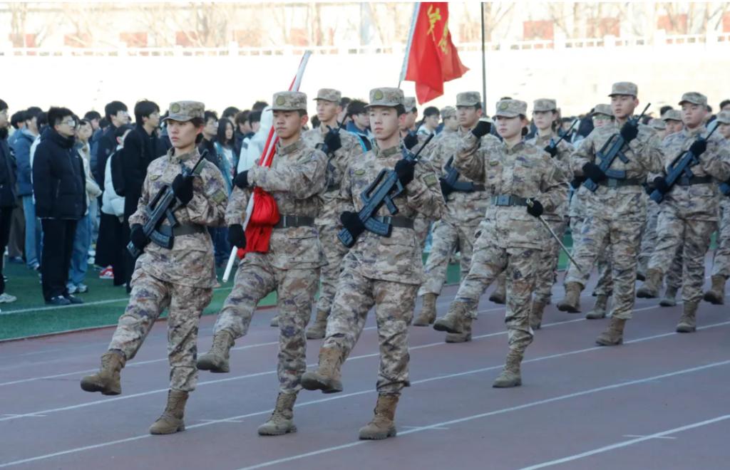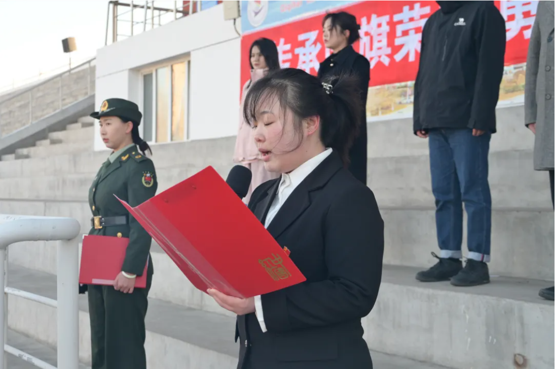 仪式进行第一项,升国旗,奏国歌。迎着朝阳,学长教官团身姿挺拔、目光坚定,手持国旗,迈着铿锵有力的步伐走向升旗台。伴着国歌,国旗缓缓升起,迎风飘扬。