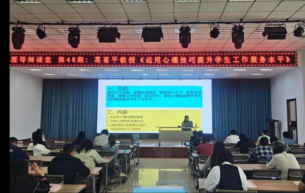 8日,葛喜平教授在二号教学区2508会议室为各学院副书记、学工处与学发中心全体教职工、辅导员及生涯导师作了题为《运用心理技巧提升学生工作服务水平》的专题交流。讲座从大学生心理问题的典型表现入手,系统分析了不同阶段学生心理变化的特点,重点讲解了心理危机排查的多元途径与预警机制,并阐述了心理问题的分类管理以及危机干预中的多部门协作流程。葛喜平还详细介绍了如何有效向学生推荐心理援助资源、如何在干预中保持专业边界,以及如何开展系统、温暖的人文关怀与心理疏导。