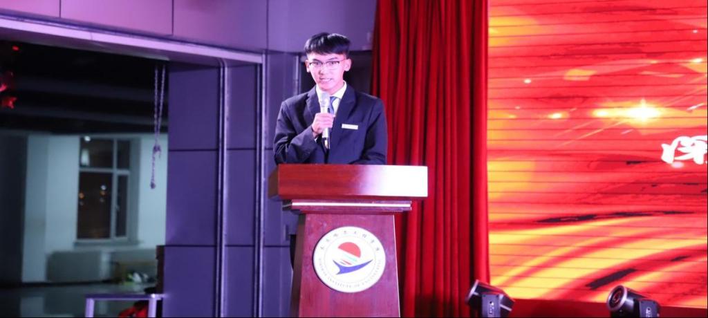 “十佳新生”代表管理工程系电商222付梦海上台发言。他说:“感恩学校的培养,必将以此为起点,勤奋学习,积极实践,无愧新生奖的荣誉和激励。”