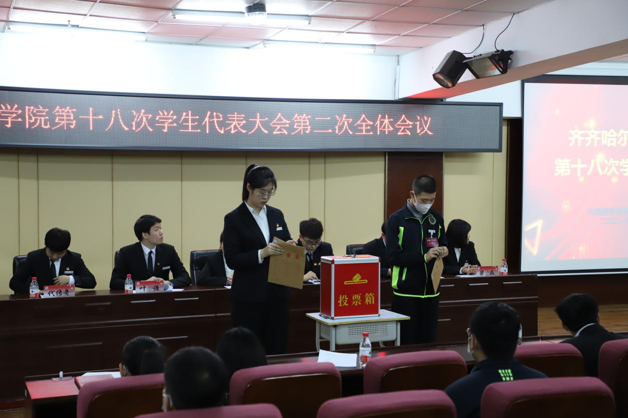 学生代表根据候选人演讲,认真填写好选票,郑重而有序地将选票投入投票箱。经过投票,大会选举产生梁淼、李泽旭、代传奇三名同学当选第二十八届学生会主席团成员。