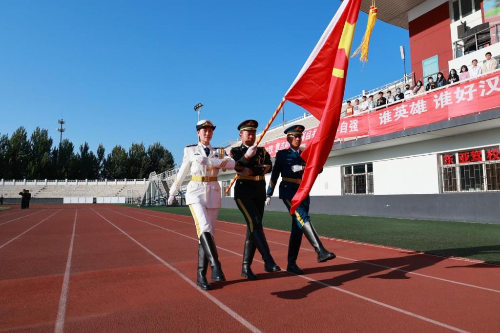 大会伊始,全体起立,升国旗、奏唱国歌。40名教官组成的国旗护卫队迈着坚定有力的步伐护送国旗,伴随着雄壮的《中华人民共和国国歌》,鲜艳的五星红旗冉冉升起。