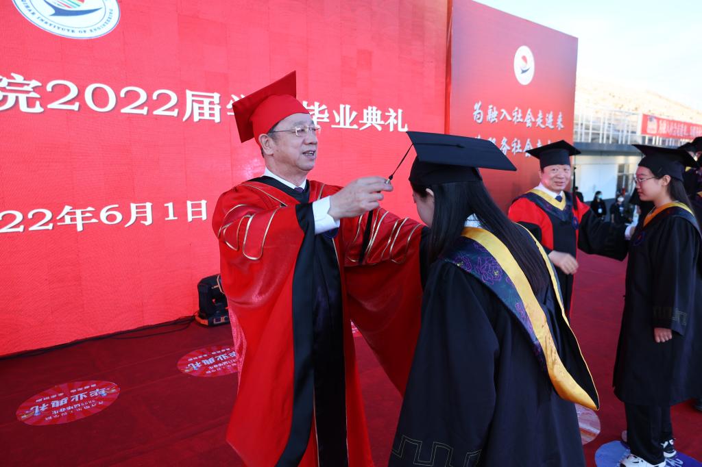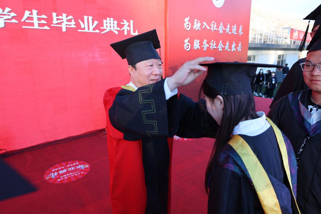 典礼仪式上,77位毕业生代表在《加冕进行曲》中依次走上主席台,理事长曹勇安逐一为获得学士学位的毕业生拨正流苏,院长曹然彬为他们正衣冠。