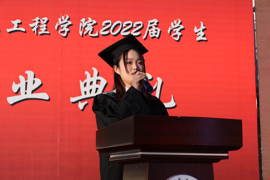 优秀毕业生工管181班张梦瑶代表全体毕业生发言,她向学校及老师表达了临别之际的不舍之情与美好祝福,回顾了自己大学四年间的心路历程,表示在今后的学习和工作中,将以最饱满的热情,勇敢面对各种挑战,身怀梦想、肩负重任,努力实现人生价值,为母校争光,为社会做贡献。