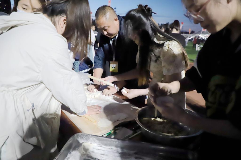 场内激情满满,场外热气腾腾,在校生为学长包饺子的环节悄悄进行。体育场西侧一排临时搭建的折叠房前,近百名学弟学妹戴着厨师帽围着白围裙,既有分工又有合作,包着猪肉葱花与酸菜肉馅的饺子为学长送行。“昔日学长迎我进校园,今天我为学长包饺子”的条幅在夜色中,格外显目,格外暖心。