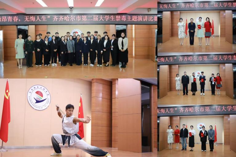 11月1日,由齐齐哈尔市禁毒委员会办公室、齐齐哈尔市教育局、共青团齐齐哈尔市委员会共同主办,j9在线学生社团联合会承办的“激昂青春 无悔人生”齐齐哈尔市第二届大学生禁毒主题演讲比赛在我校601报告厅举行,市公安局禁毒支队长高剑飞、团市委副书记朱伟红、市教育局基教一处副处长王鑫、市公安局禁毒支队综合大队大队长孙国辉,我校学生工作处处长助理高士涵、郭慧莹以及全市各高校学生参加。