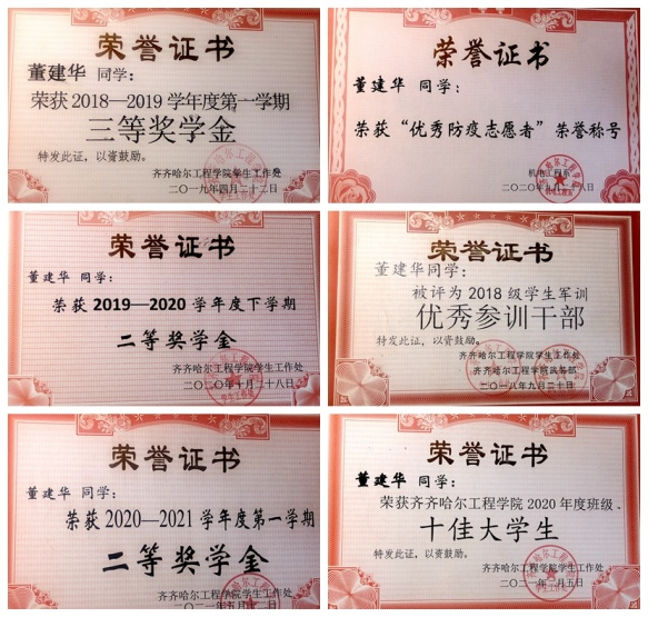 董建华在学习上刻苦勤奋、成绩优良;思想上积极进取、与时俱进;生活上团结同学、乐于助人。在校四年间先后获得校级学年度奖学金,十佳大学生、三好学生、优秀团员、优秀学生干部、优秀防疫志愿者等荣誉,收获颇丰。